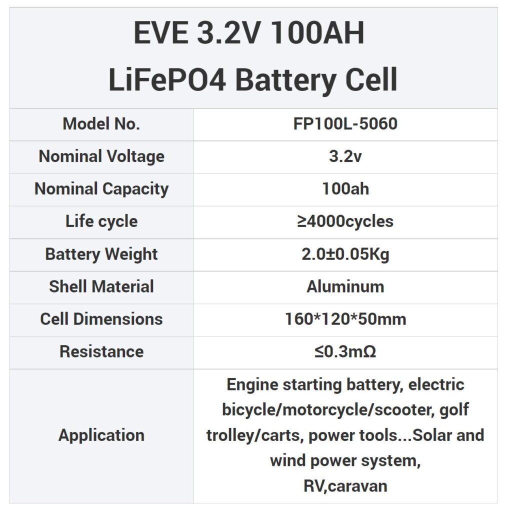 Overall, EVE’s 100Ah 3.2V LF100MA LiFePO4 batteries are a reliable and efficient choice for various energy storage and power applications.